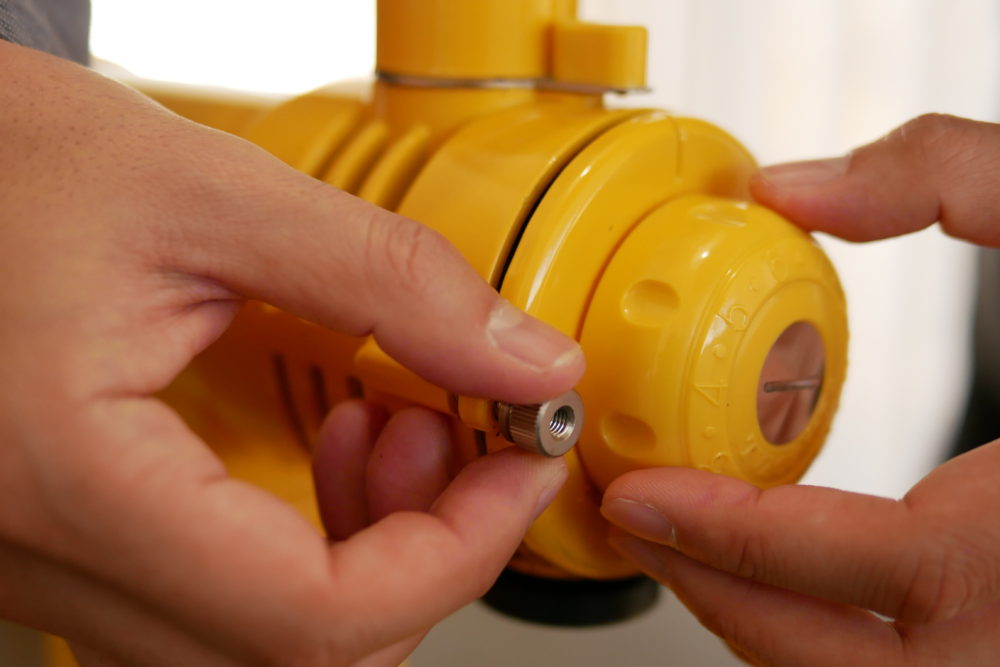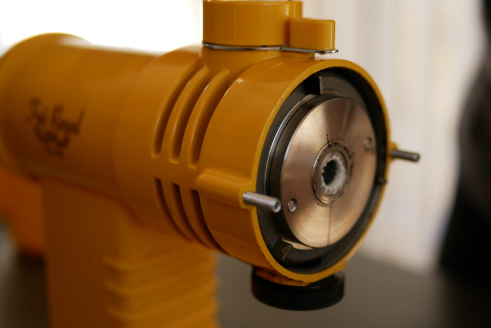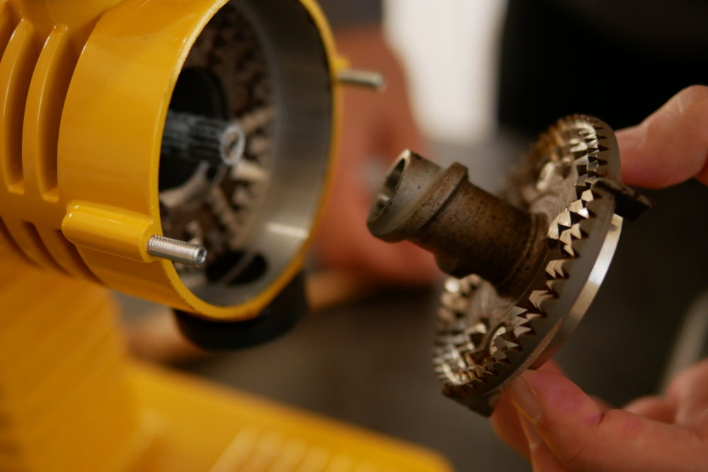 つまんでまっすぐ引き出すとブレードがあらわになります。この部分でコーヒー豆をすり潰しているんですね、なかなか荒々しくてカッコイイ見た目です。